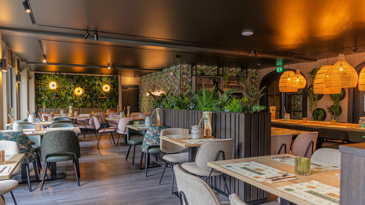Next level culinair genieten. Kijk eens naar boven voor ons maatwerk lamellenplafond in deze hoge ruimte.
